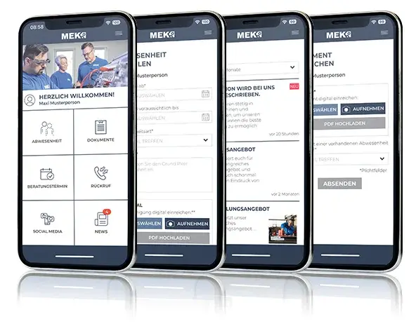 Mit der MEK-App haben Sie alle wichtigen Funktionen und Informationen direkt auf Ihrem Smartphone – schnell, sicher und unkompliziert. Die App wurde speziell für Teilnehmende unserer Bildungsmaßnahmen entwickelt, um die Kommunikation mit unserem Team zu erleichtern und zu verbessern. So haben Sie jederzeit Zugang zu allem, was Sie benötigen – ob zur Abwesenheitsmeldung, dem Austausch von Dokumenten oder der Anfrage von Beratungsgesprächen.